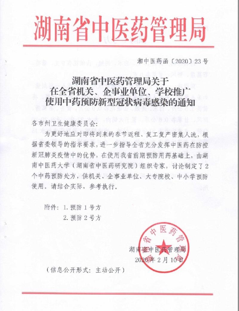 2月10日,湖南省中医药管理局向全省各市州卫生健康委员会(公开)印发了《关于在全省机关、企事业单位、学校推使用中药预防新型冠状病毒感染的通知》。