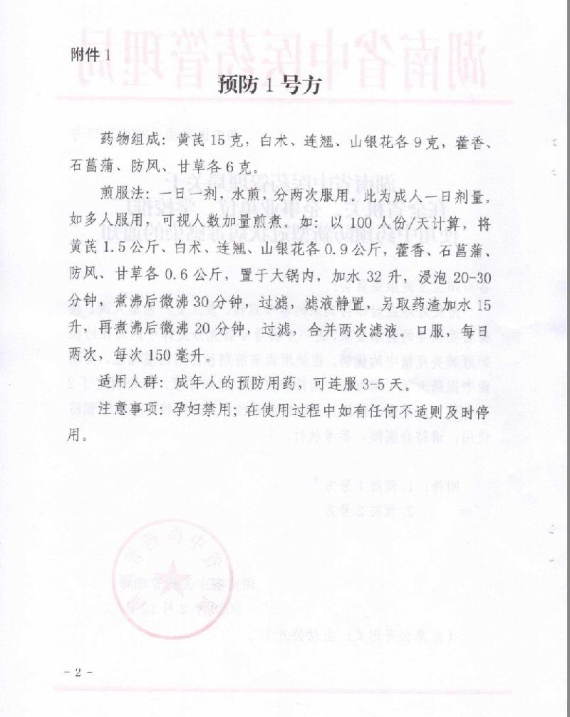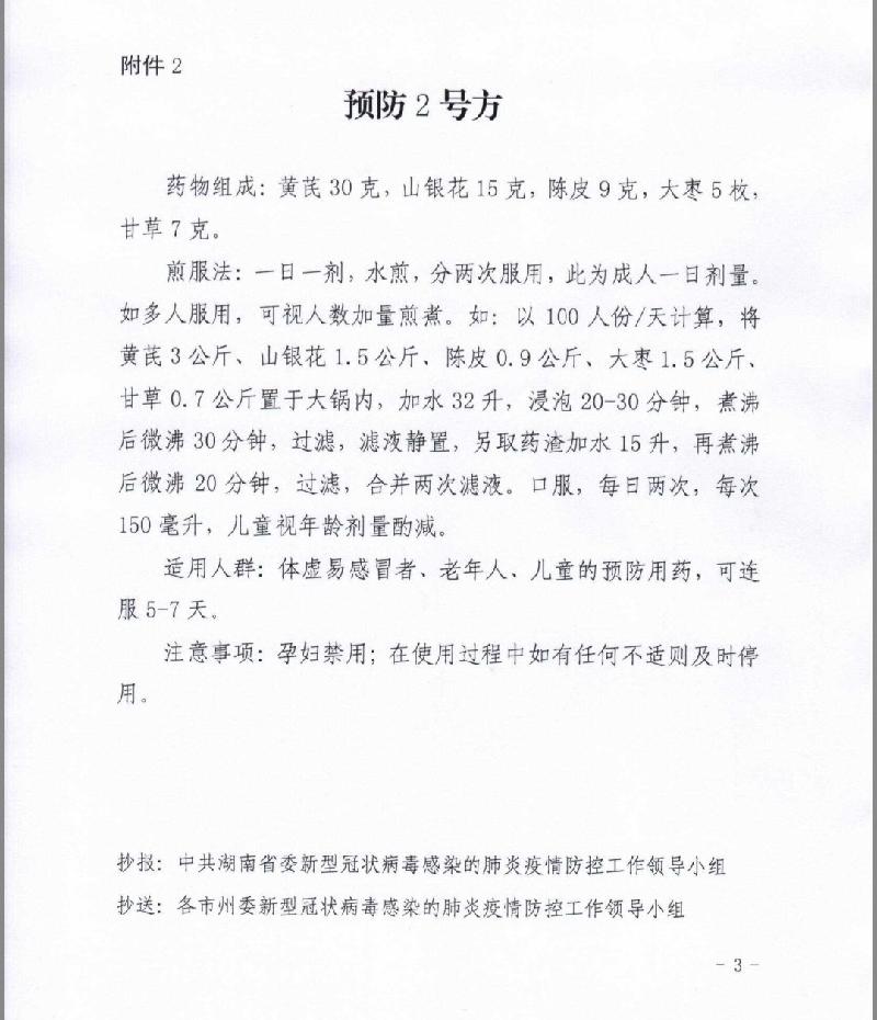 《通知》指出:“为更好地应对即将到来的春节返程、复工复产密集人流,根据省委领导的指示要求,进一步指导全省充分发挥中医药在防控新冠肺炎疫情中的优势,在使用我省前期预防用药基础上,由湖南中医药大学(湖南省中医药研究院)组织专家,讨论制定了2个中药预防处方,供机关、企事业单位、大专院校、中小学预防使用。请结合实际,参考执行。”