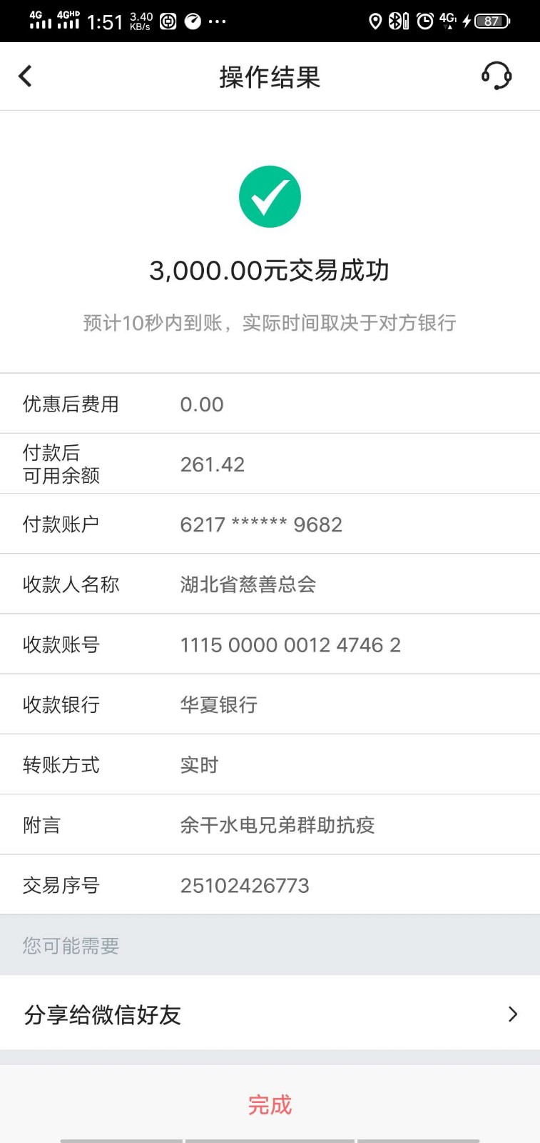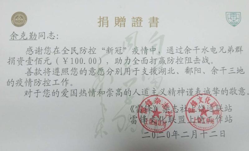 特别说明:雷神衛東余克勤在水电兄弟群以个人名义捐资100元,以雷神衛東(《雷锋》杂志上饶通联站名义捐资1000元,另水电兄弟群主“蜘蛛侠”15000元微信转账提现手续费均由本个承担,本人以官方慈善工作者及雷锋精神的传承传播者名义保证,响应雷锋精神号召,通过本人捐献的爱心每一分都会转到相应的防疫作战机构部门,真正用于资助全面、快速打赢全民防疫阻击战……凡捐献100元以上者,由《雷锋》杂志社上饶通联站、雷锋文化联盟上饶工作站联合发放“新冠“防疫专项捐赠证书。
