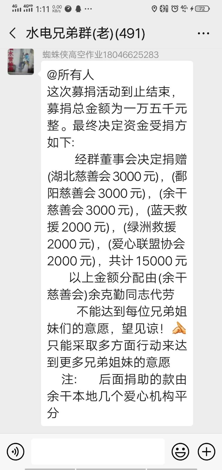 2月8日,由余干水电兄弟群主“蜘蛛侠”、群友何军峰水电安装等心怀爱国热情、爱心善行的网友自发在网络空间发起募捐动员,目前通过水电兄弟群共捐资15000元,分别捐向湖北省慈善总会、鄱阳县慈善会、余干县慈善会三家官方慈善公益机构(每家3000元和余干县爱心联盟协会、余干县蓝天救援队、余干县绿舟应急救援队三家民间公益组织(每家2000元),专项用于支援防控“新冠”疫情工作开展。