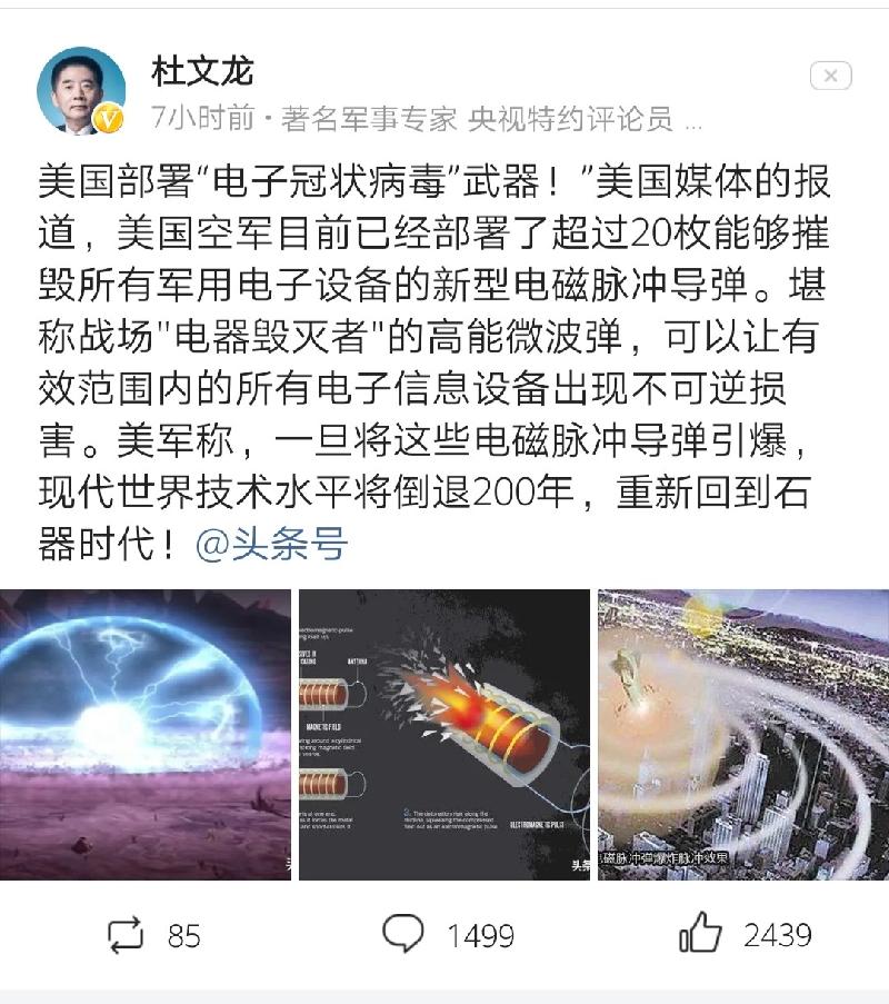 2月18日,据我国著名军事专家、央视特约评论人杜文龙透路:美国媒体的报道,美国空军目前已经部署了超过20枚能够摧毁所有军用电子设备的新型电磁脉冲导弹。堪称战场"电器毁灭者"的高能微波弹,可以让有效范围内的所有电子信息设备出现不可逆损害。美军称,一旦将这些电磁脉冲导弹引爆,现代世界技术水平将倒退200年,重新回到石器时代!