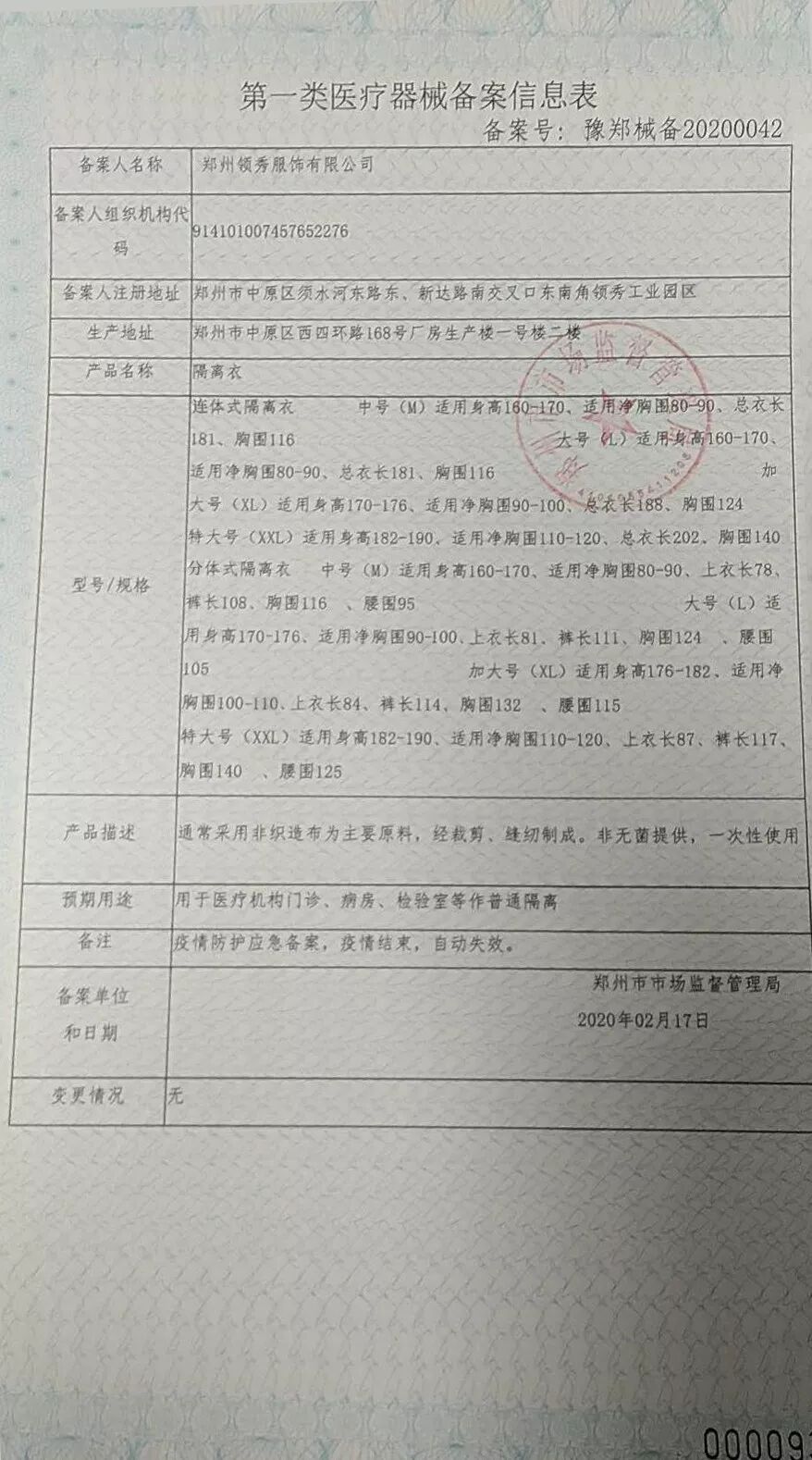 目前,领秀已获批一类医疗器械生产资质(医疗器械备案号豫郑械备20200042),这一批生产的医用隔离服将为医疗机构门诊、病房、检验室等提供普通隔离;为生产车间、办公空间、门卫、交通卡口、街道办、社区等场地,提供有效隔离病毒侵害。