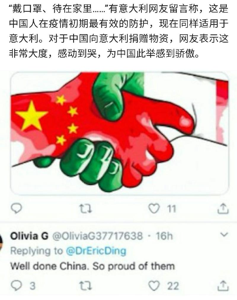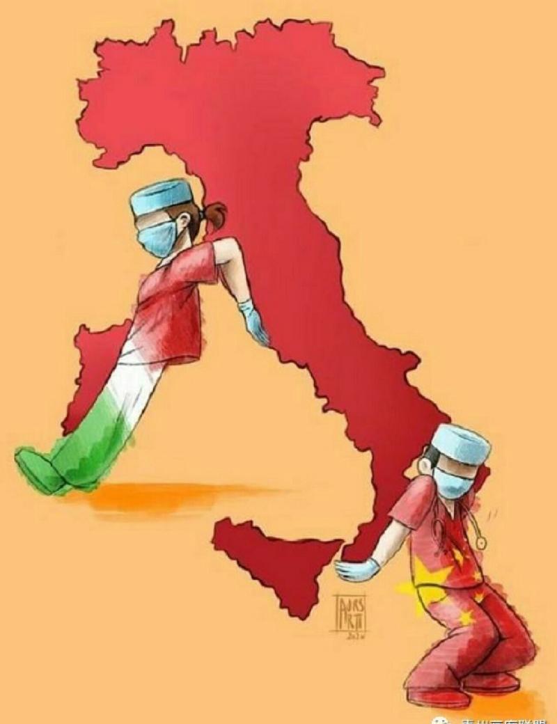新冠病毒最终在全国人民同心协力下得以控制。现在世界上除中国之外疫情告急,有的国家因为疫情施虐一片混乱,向中国求救。中国杏林精英们来不及歇息又踏征程,中国本着国际人道主义精神一个省支援一个国家。现在中国就是全人类救世主!意大利人民在居住区播放中国国歌!他们还高喊:“谢谢中国”!他们也许觉得这是感激中国最好的方式。不像某的国家平时口口声声喊他们是兄弟,可是在他们有难时却给他们一个后背。