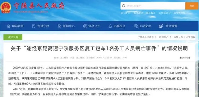 3月23日,陕西省安康市宁陕县政府官网就“途经京昆高速宁陕服务区复工包车1名务工人员病亡事件”做出情况说明如下,3月23日7时许,患者田某某救治无效死亡。死者田某某汉坦病毒(出血热)核酸检测为阳性,同时,对同车其他29人全部落实就地医学观察措施。目前,其他人员的核酸检测正在采集送样。