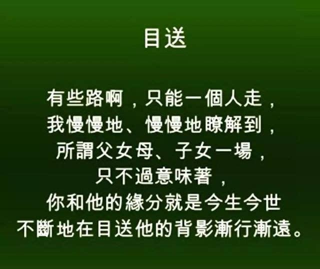 我慢慢地、慢慢地了解到,所谓父女母子一场,只不过意味着,你和他的缘分就是今生今世不断地在目送他的背影渐行渐远。你站在小路的这一端,看着他逐渐消失在小路转弯的地方,而且,他用背影默默告诉你:不必追。 —— 龙应台《 目送》