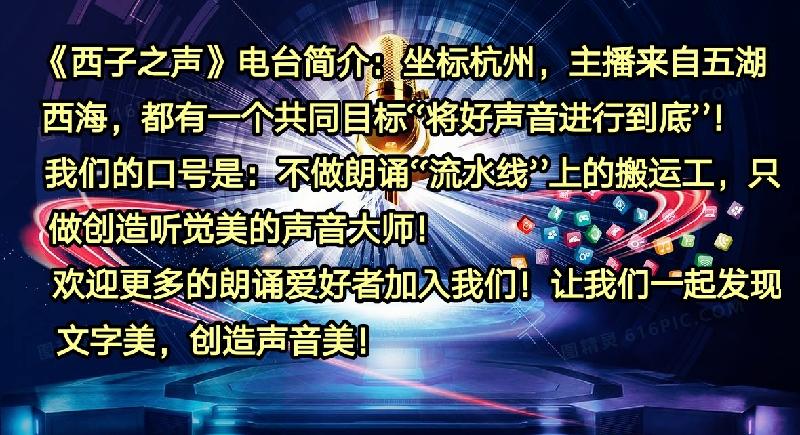 主播雪儿:私企经营管理者,从小就爱好朗诵、音乐,曾担任电视台业余主持人。现是杭州市朗诵协会会员、杭州之声朗诵团团员!是多家文学平台的特约主播!有朗诵培训工作室!愿用我的声音传递美好!(微信号zhulihui075920)