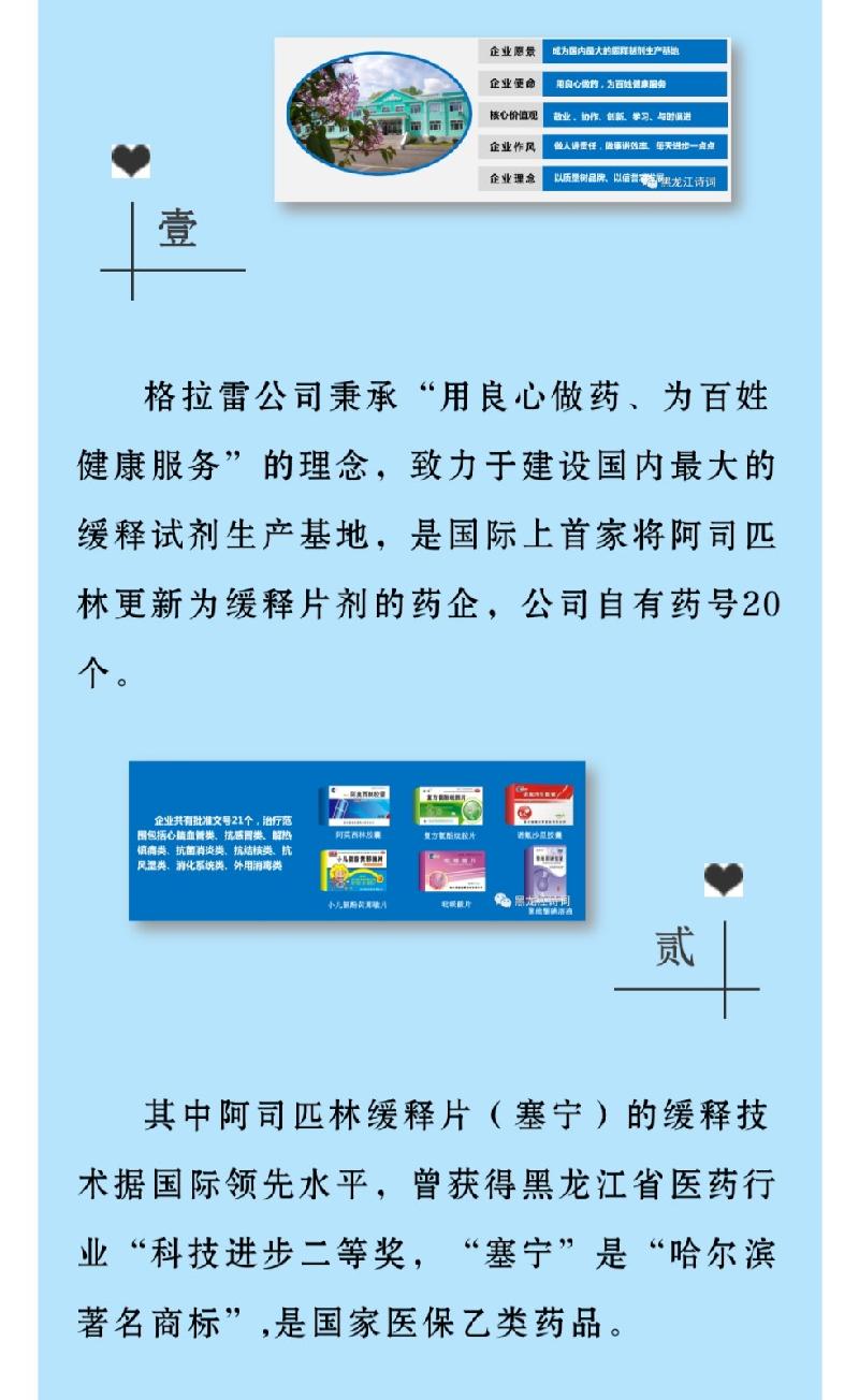哈尔滨格拉雷药业有限公司始建于1972年,建厂48年,前身隶属于黑龙江省医药采购供应站,哈药系列生产厂之一,经过了两次改制,1994年更名为格拉雷药业股份有限公司,现为股份制企业。公司拥有4.86万平方米的药品生产工业园区和现代化的GMP生产厂房,下设片剂、胶囊剂、溶液剂三个车间,拥有一支200余人的专业工作团队,有科研能力较强的执业药师、中高级技术人员研发队伍,有经验丰富的优秀销售队伍,在全国建立了完善的代理商营销网络,在22个省市自治区设立销售代理处。