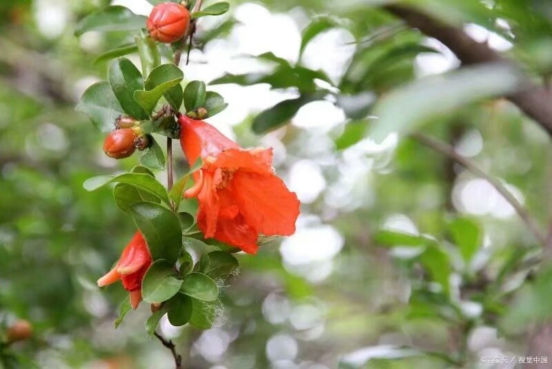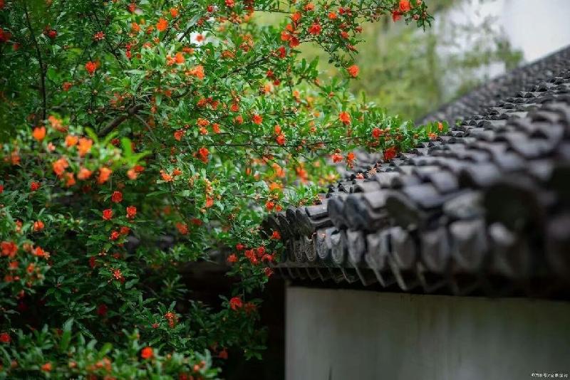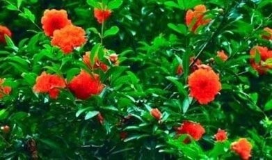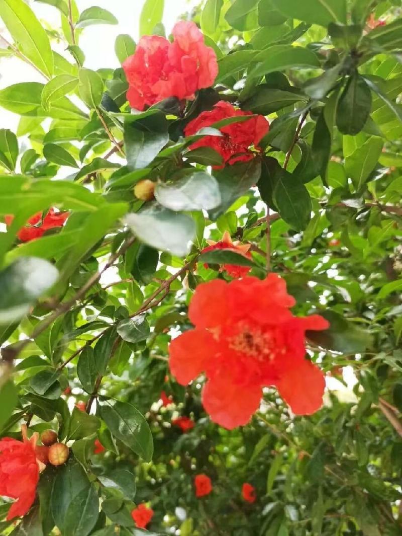 东面,院墙外,不知哪家的几株石榴树,高高地伸出墙头,枝叶繁茂,翠绿欲滴,那火红的花朵在雨后阳光的映照下,显得格外娇艳,引人注目。我不禁前去踮脚细看,有的叶露初显,红如鸟舌,润丽鲜艳;有的花瓣绽开,清香幽幽,神清气爽;有的含苞待放,娇羞欲语,纯情可爱;有的残花谢落,打苞挂果,翘首蓝天。那些红艳艳的石榴花朵点缀在青枝绿叶中,招来许多蜜蜂莺歌燕舞,让你无不联想到收获季节那香甜可口的大大的圆圆的石榴仿佛就在口边。这是几株名副其实的既开花又结果的石榴树。它知时而开,惊艳四方,把美丽送给人间;它挺立枝头,迎风吐蕊,美的璀璨,美的灿烂,美的梦幻;它出尘脱俗,艳而不妖,不轻狂不张扬。远远望去,那橙红的繁花,摇曳枝头,如蝶舞,如朝霞,如云彩,在金色阳光的沐浴下宛若仙子,绝世而立,风姿绰约 ,充满着旺盛的活力,孕育着美好的未来。