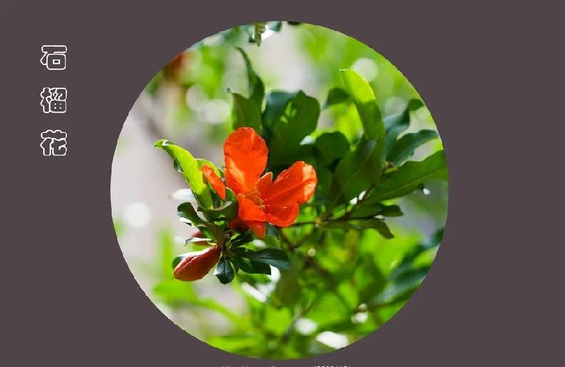 历代诗人描写石榴,往往着笔于一个“红”字,又因其色红艳似火,鲜丽如锦,便又有“榴火”、“榴锦”等称誉。如隋代魏彦深的“新枝含浅绿,晩萼散轻红”;宋代王安石的“万绿丛中一点红,动人春色不须多”;元代张可久的“海榴浓喷火,萱草淡堆金”等等,都将石榴的“红”描写到了极致。元代张弘范的《榴花》诗曰:“猩血谁教染绛囊。绿云堆里润生香。游蜂错认枝头火,忙驾薰风过短墙。”石榴花香,引来蜜蜂采蜜,见到犹如血染的石榴花,竟误以为是枝头着了火,慌忙飞离。五月的榴花如火光霞焰般的壮美。