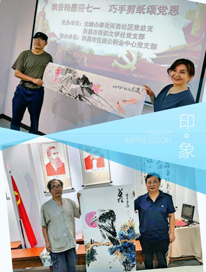2020年6月29日上午,许昌市魏都区文峰办事处河西社区党总支部、许昌市荷韵文学社党支部、许昌市住房公积金中心党支部共同开展了“飘香翰墨迎七一 巧手剪纸颂党恩”活动,文峰办事处河西社区党总支书记张琳、荷韵文学社党支部书记武保莉为活动致辞。活动特别邀请 许昌市肖像剪纸艺术家田秋香女士,带领同志们进行党旗剪纸制作,用这种传统民间的艺术形式表达大家对建党99周年的热情。
