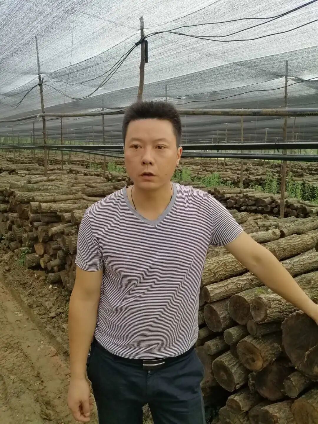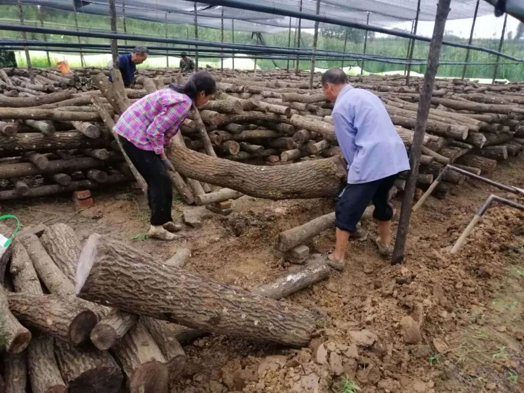 走进洋县溢水镇西山村汉鹮珍菌生态家庭农场,绿树环抱之中,一片占地四十多亩的遮阳网下,一根根断节后点种成型的菌棒整体的码放成排。