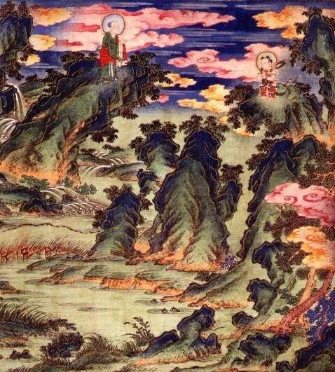 善财一心参拜善知识者,没有闲心欣赏这些美景。逢人便问海云比丘的住处,没有一个人知道。最后问到一个老者,他指着海边的高山说:“那山顶石门处就是海云比丘的住所。”