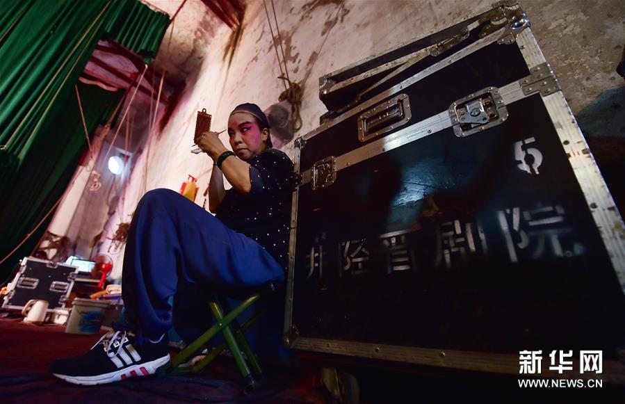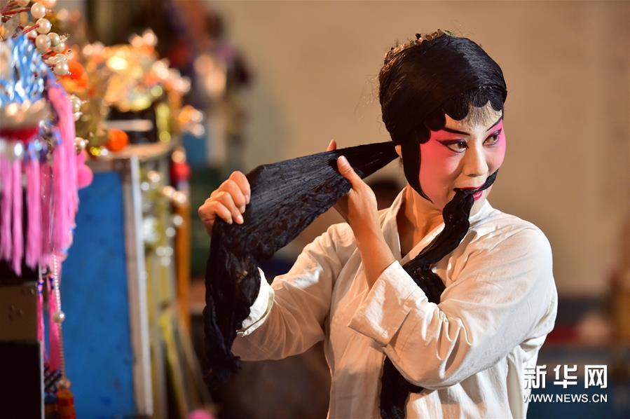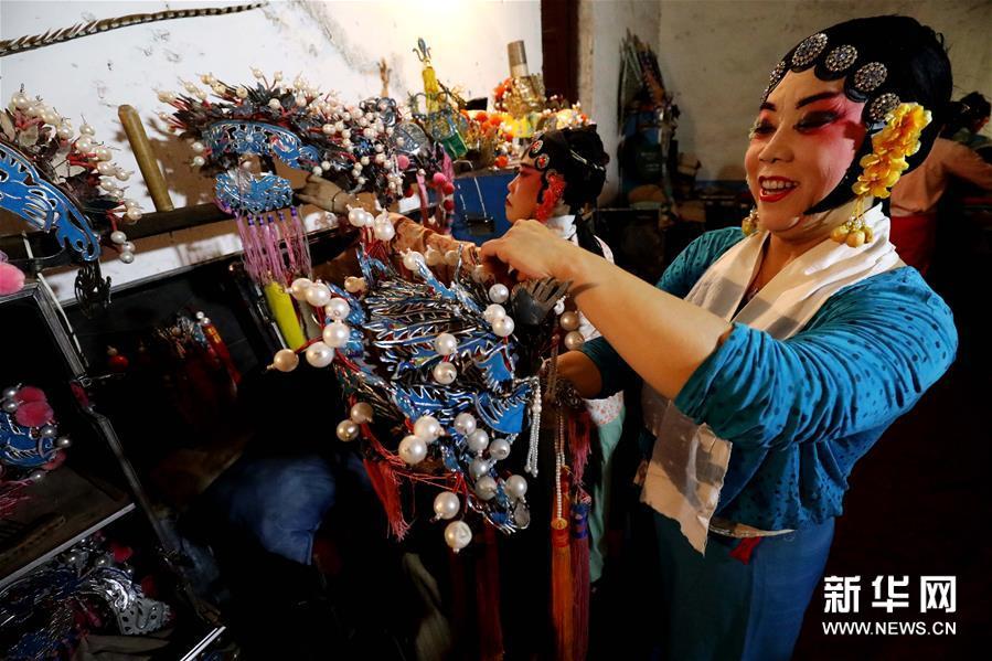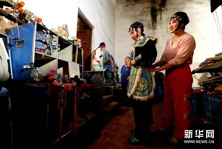 8月5日,在河北省石家庄市井陉县上安镇头泉村村民文化广场,井陉晋剧院戏曲演员在后台整装待演。新华社发(梁子栋 摄)
