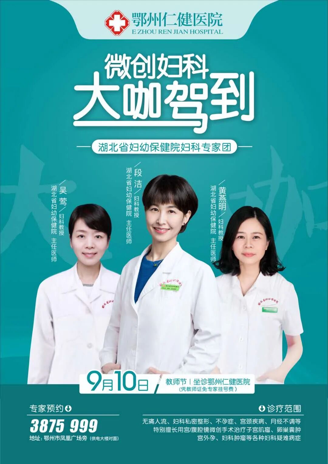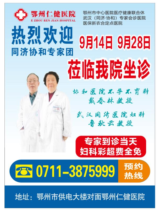 9月14日和9月28日,武汉同济医院妇科鲁秋云教授、主任医师,武汉协和医院中医科戴春林教授、主任医师也将来到仁健医院为广大患者坐诊。9月20日,,湖北省妇幼保健院妇科段洁教授、主任医师,妇科黄燕明教授、主任医师,妇科吴莺教授、主任医师也将在仁健医院坐诊,与广大患者面对面交流。