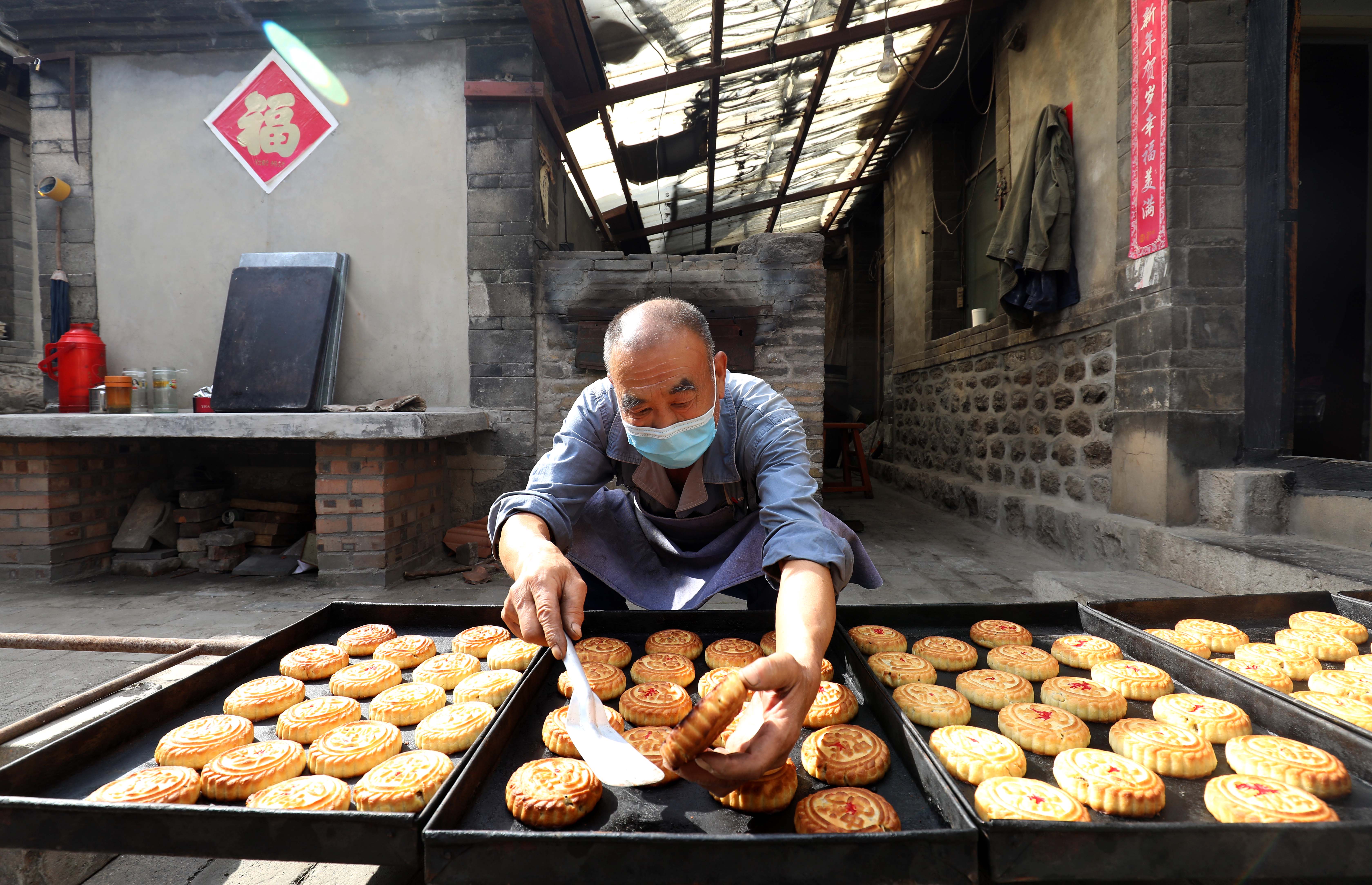 ↑9月12日,石家庄市井陉县天长镇的“端盛长”传统手工月饼制作工坊的工作人员在检查烘烤好的月饼。