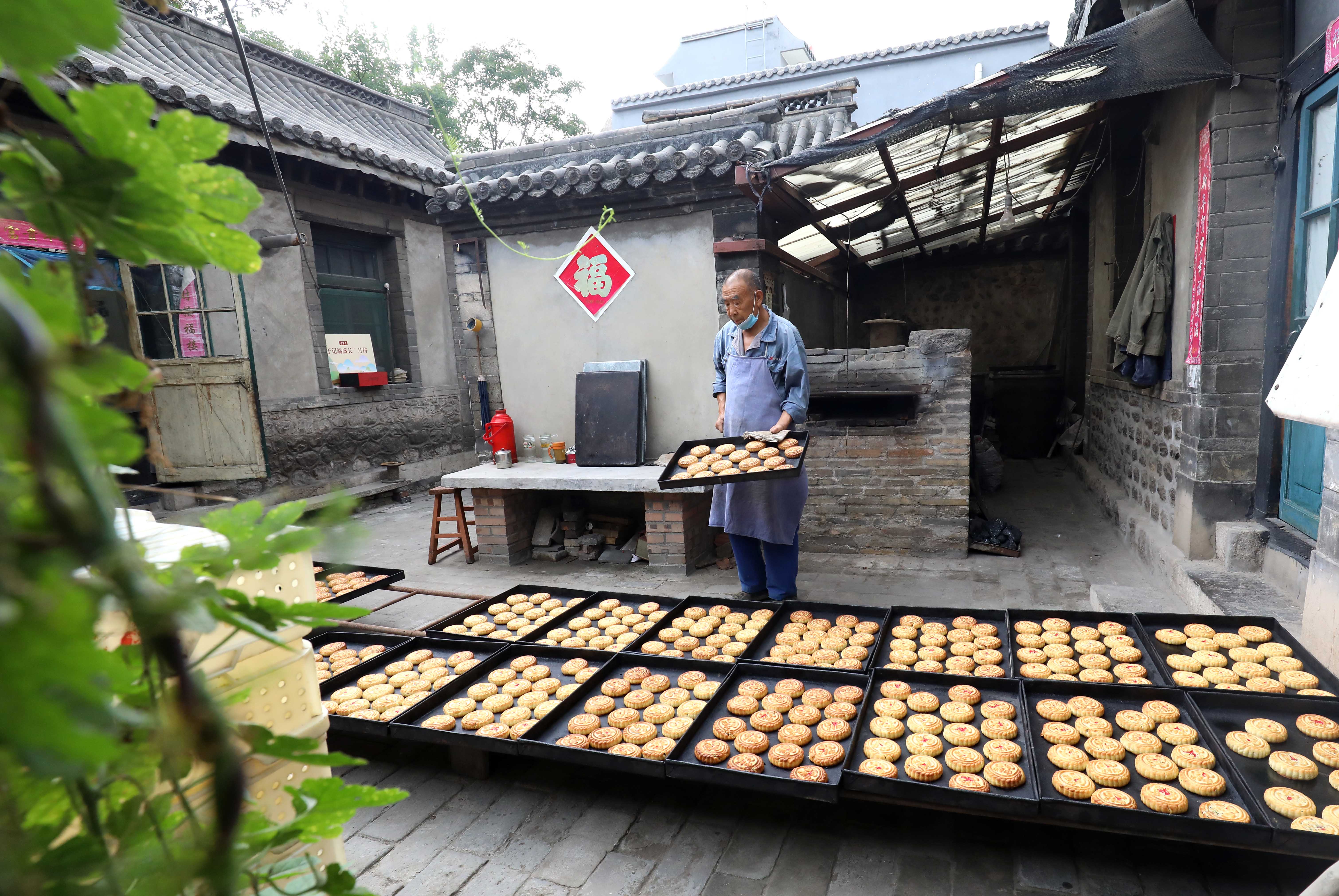 ↑9月12日,石家庄市井陉县天长镇的“端盛长”传统手工月饼制作工坊的工作人员从土炉内取出烘烤好的月饼。