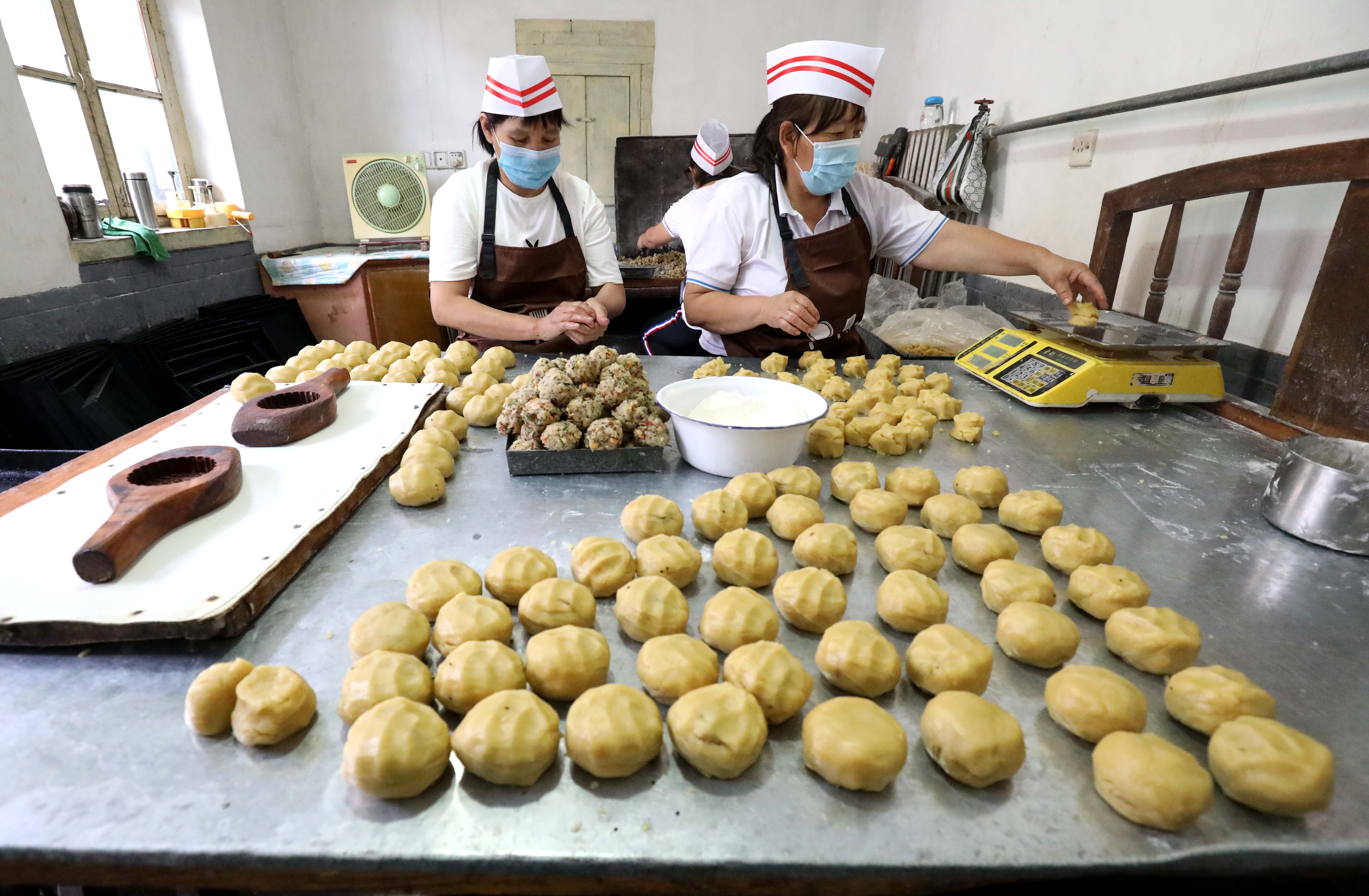 随着中秋佳节的临近,位于河北省石家庄市井陉县天长镇的“端盛长”传统手工月饼制作工坊开始忙碌起来,工作人员开足马力制作月饼。据了解,井陉县天长镇“端盛长”传统手工月饼制作工坊起源于清代,距今已有百余年历史。“端盛长”传统手工月饼以五仁和豆沙馅为主,从和面、做馅、擀皮一直到包制、印模、烘烤,每一道工序均为手工制作完成。