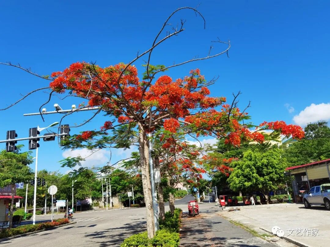 南洋有斗羊比赛,一只白羊跟一只黑羊相互用犄角顶对方,两只羊你顶我一下,我顶你一下,场面不是很激烈。可能是羊的脾气真的是温顺吧,或者是它们都不想伤害对方,只是应付四周看台上大呼大叫的人们。反正让两只羊比出个输赢来,是件很难的事。两只羊都不下死手,羊犄角都是慢慢的优雅的伸向对方。阿凰每次在赛场,都祈祷白羊获胜。大人们下赌注时,有赌白羊赢的,有赌黑羊赢的,阿凰年龄小,衣兜里的钱自然也少,只能是在心里下赌注保佑白羊赢! 可是阿凤把阿凰的话理解为了阿凰不同意跟他往深里相处,阿凤这次是真的有些急了;你不到我家去放羊,咱俩能象我哥跟我嫂子一样的在一起吗? 阿凤这句直接了当的问话,阿凰就算是再反应迟钝,也是听明白了,她一跺脚,是喜是悲是同意是不同意,她自己真的是理不清楚了,她抬起头看到了微风中摇摆的凤凰花,顺口就说了出来:“要是这条路的两侧种满了凤凰树,开满了凤凰花,那时你再提放羊的事吧!”。 没想到阿凤这个机灵鬼也有犯浑的时候,他真的开始四处寻找凤凰树了,用了多长时间不清楚,直到终于有一天,这条甬道的两边都种上了凤凰树。后来这条五、六百米的甬道被扩建成了柏油马路,凤凰树被人们小心翼翼的移植到步行道跟柏油马路中间,成为了隔离带。凤凰树做隔离带,这条街自然的就被冠名为凤凰街了。每年的四月下旬,凤凰花就开始红上枝头了。至于阿凤跟阿凰后来的事情,我还没有打听到确切的消息!2020年5月23日于海南岛兴隆