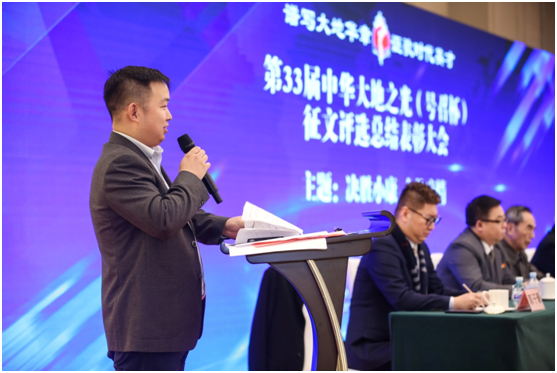 第十一届全国政协副主席李金华宣布:“第三十三届中华大地之光(号召杯)征文评选总结大会现在开始”!第十三届全国人大农村与农业委员会副主任李春生;中央电视台原副台长、央视网总顾问赵立凡;中国小康建设研究会常务副会长兼秘书长李彬选;中国记者协会国内部原主任、中华大地之光征文组委会主任阮观荣;人民日报海外网总编辑、中国小康建设研究会党刊工作委员会常务主任褚多峰;中国流通行业管理研究会中小企业联合发展研究会书记张立超;《企业家日报》社社长助理罗红耀;深圳市浩召电子商贸有限公司总经理张号召;中国未来教育基地副校长郭子豪等领导出席大会。中华大地之光征文组委会主任、中国记协国内部原主任阮观荣发表热情洋溢的开幕辞。他阐述了本届征评活动的主题“奋战疫情、决胜小康”的现实意义;回顾了征评活动经历25个春秋的光辉历程;点出了本届“十佳新闻人物”各具特色的先进事迹。▲中华大地之光征文组委会主任阮观荣致开幕辞(图/张宾)组委会副主任唐小勇宣读了本届征文特等奖篇目和作者。