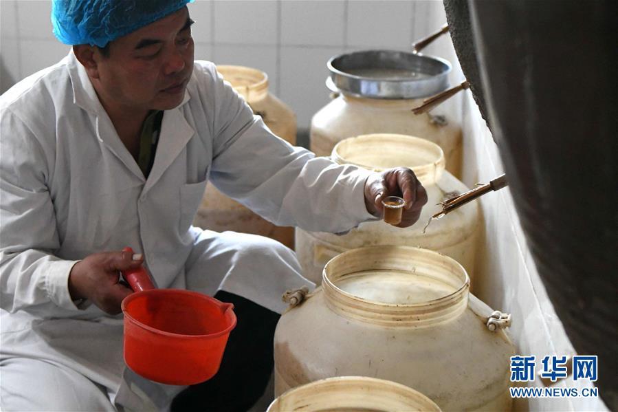 10月21日,窦王醋酿造技艺传承人仇彦军在石家庄市井陉县吴家窑乡窦王墓村酿醋工坊进行淋醋取样。