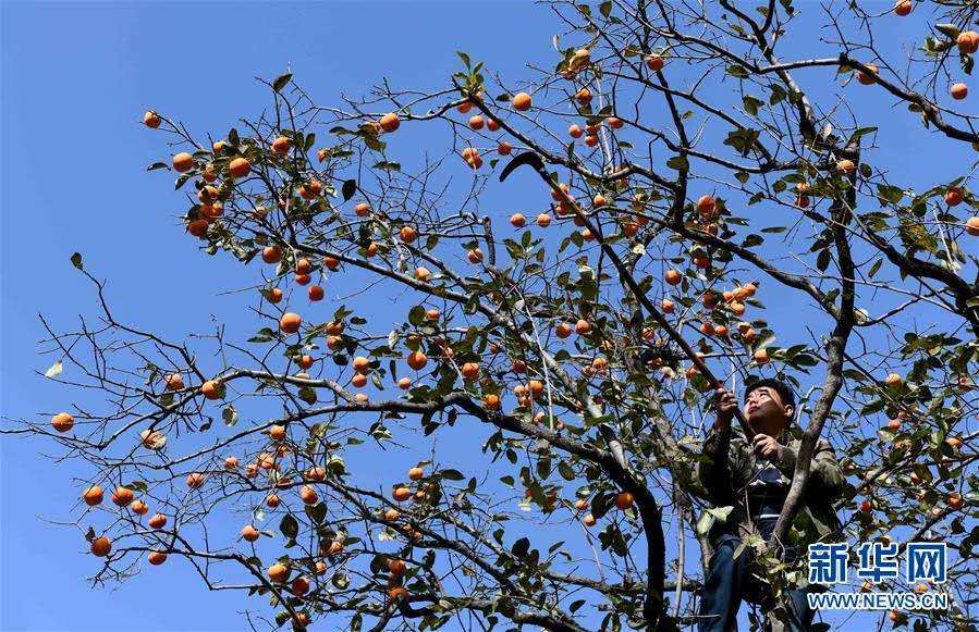 10月21日,窦王醋酿造技艺传承人仇彦军在石家庄市井陉县吴家窑乡附近山上摘取野生柿子。