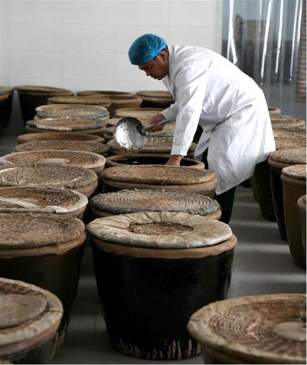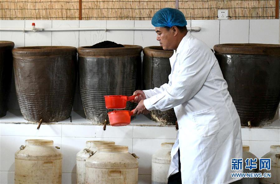 10月21日,窦王醋酿造技艺传承人仇彦军在石家庄市井陉县吴家窑乡窦王墓村酿醋工坊对发酵的醋胚进行倒缸处理。