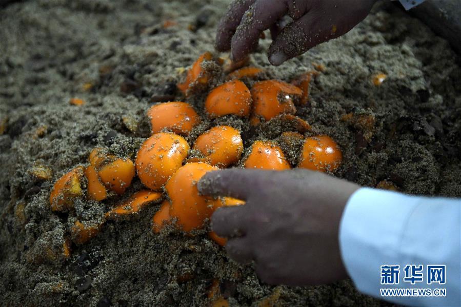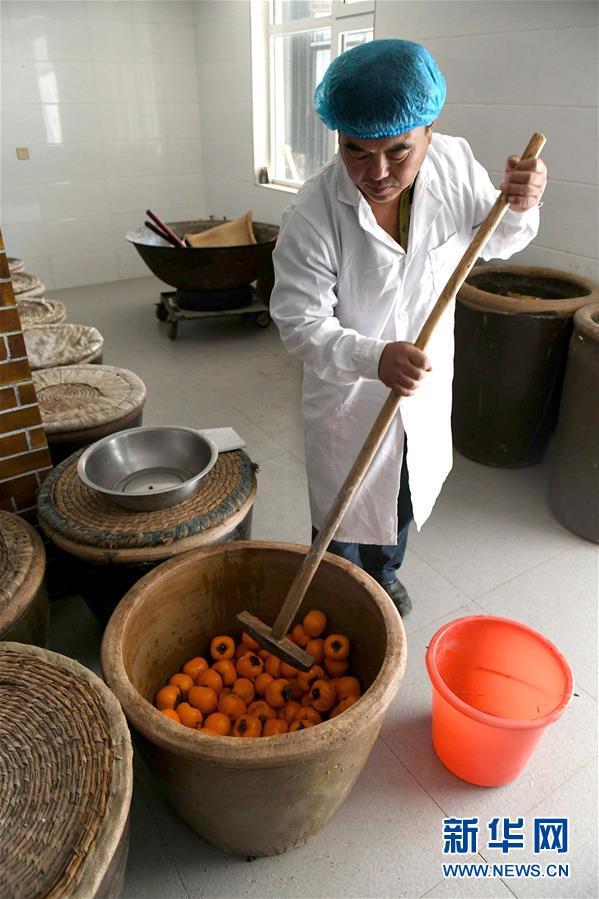10月21日,窦王醋酿造技艺传承人仇彦军在石家庄市井陉县吴家窑乡窦王墓村酿醋工坊把清洗好的柿子入缸进行发酵。