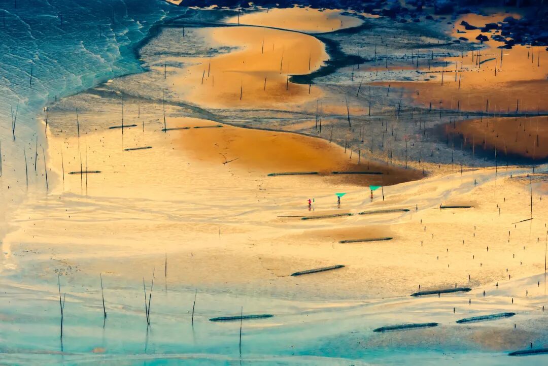 滩涂上万根竹竿插成一块块方形的网框,由远及近,绵延数十里,蔚为大观。