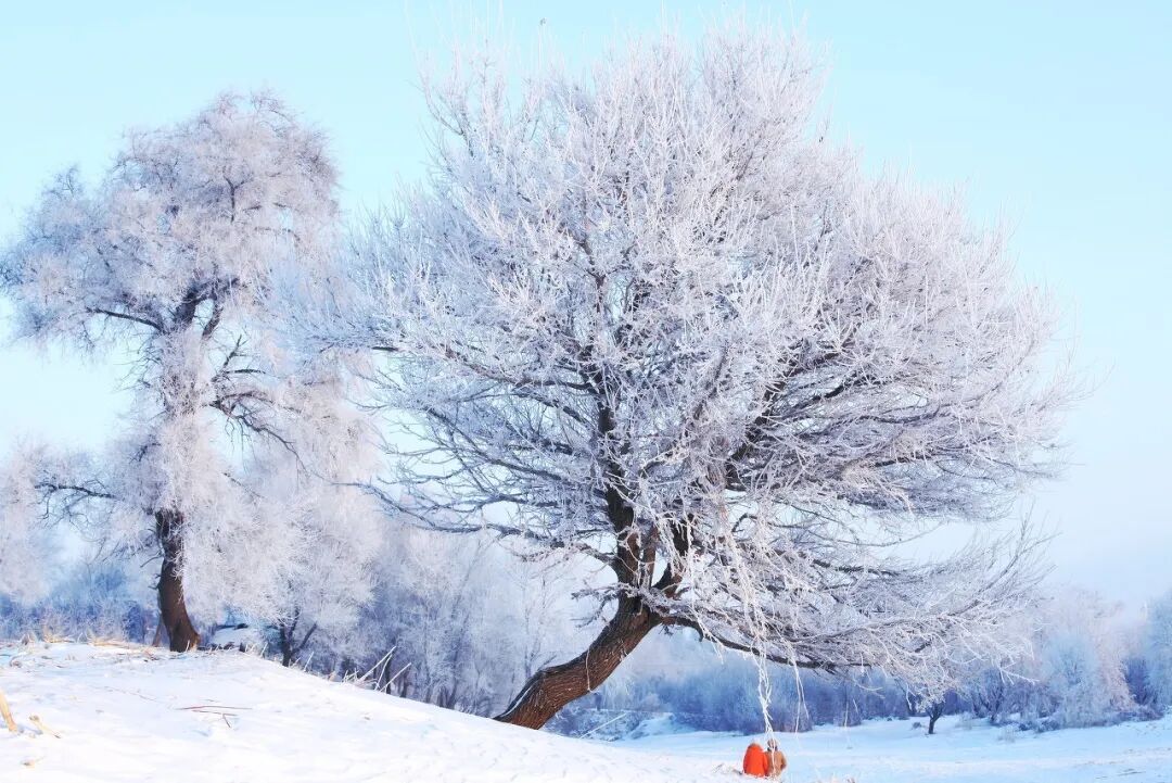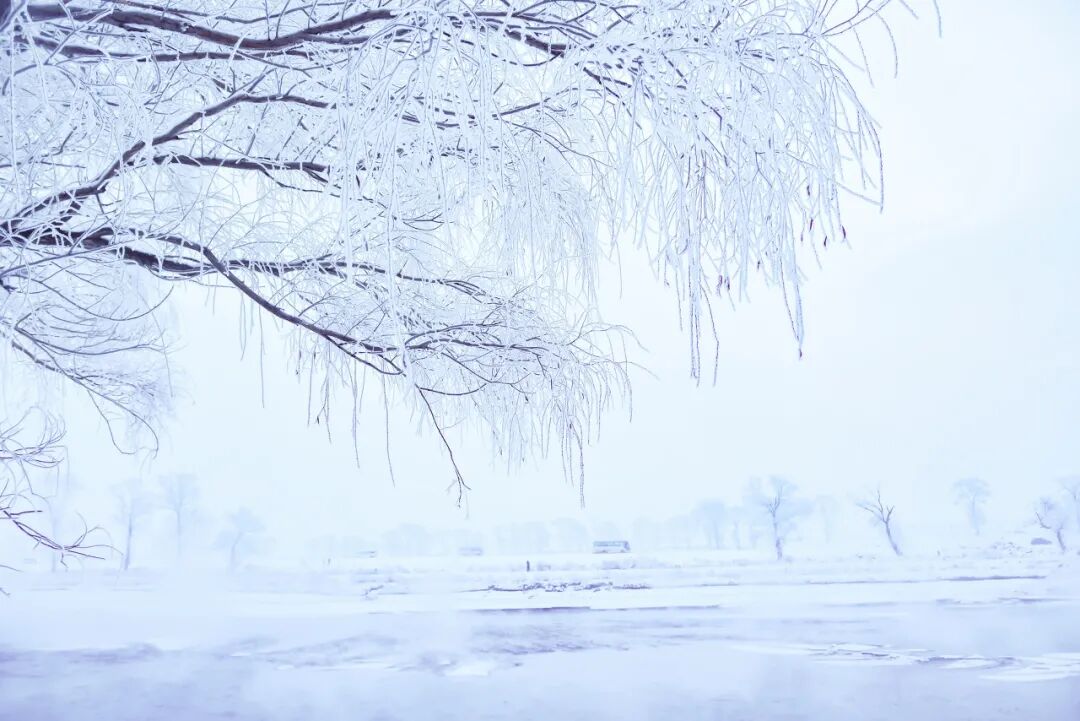 到了冬天,江边的树上挂满