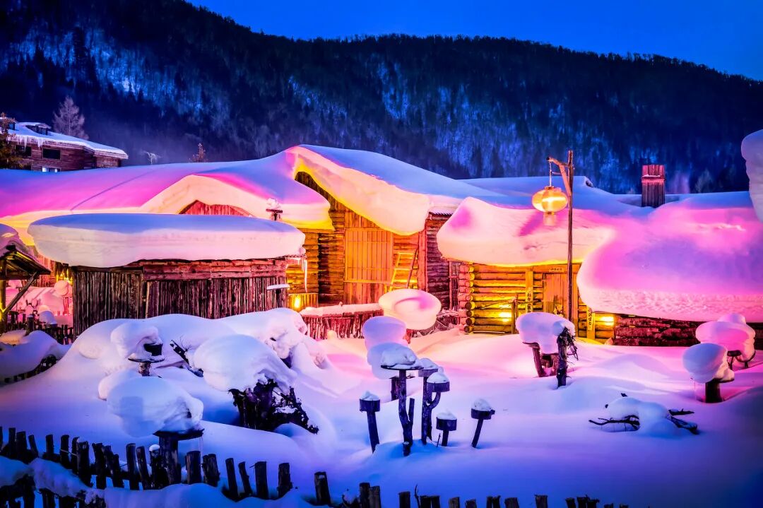 冬天厚厚的积雪堆积在房子上,夜晚,各家各户的灯一开,像极了北欧的童话王国。