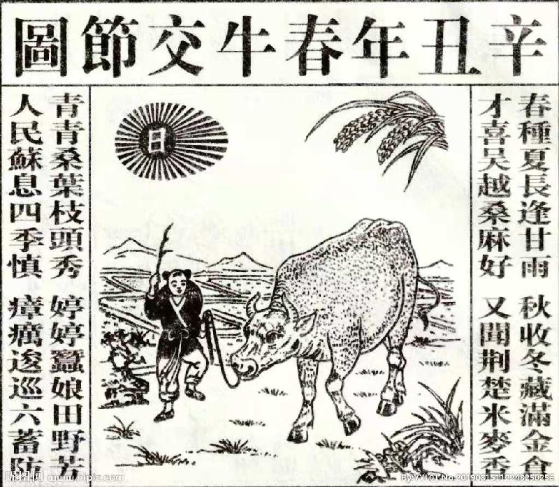 春牛就是土牛,乃是土制的牛,古时候于立春前制造土牛,好让文武百官在立春祭典中彩杖鞭策它,以劝农耕,同时象征春耕的开始。春牛身高四尺,象征一年四季。身长八尺,象征农耕八节(春分、夏至、秋分、冬至、立春、立夏、立秋以及立冬)。尾长一尺二寸,象征一年十二个月。