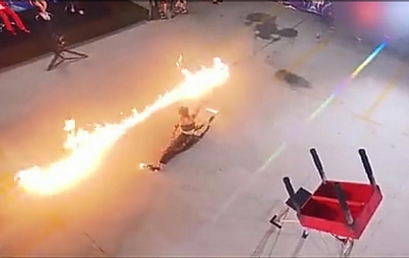 鞋尖燃火跟斗翻,地面炸烧烟火滚
