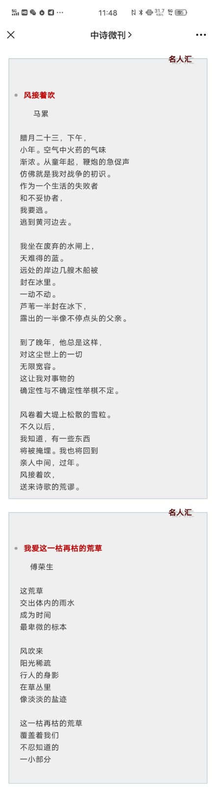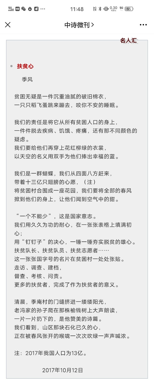 季风是江苏淮安诗人。三年多来,在参加涟水季庵村结对扶贫工作之时,他积极响应总书记“坚持以人民为中心”的创作导向,怀着对现实关注的强烈的文学创作自觉,主动融入、积极创作,日积月累,形成了一批以扶贫为主题的个性视角独特、身心体验深刻的现实主义诗歌作品。这组扶贫主题诗歌先后在今年《诗刊》《草堂》《诗选刊》《扬子江诗刊》等名刊和中国诗歌网及其公众号陆续发表。11月7日,季风发表在今年10月号《诗刊》上的《扶贫心》和《竹枝词》《早发白帝城》《沁园春•雪》等古今名典诗词一起亮相第六届中国诗歌节闭幕式为诗歌节晚会压轴。随着国内名刊名网名节等连续推出,这组系列扶贫诗歌引起诗界高度关注,在读者中产生了广泛影响。