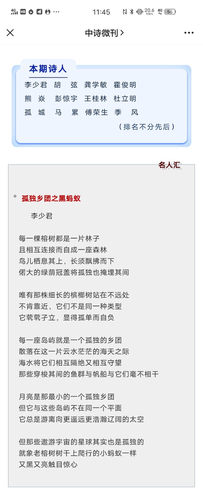 孤城说,扎实的作品,自带不容怠慢的说服力。这也是今年7月中旬,我最先在审选、编辑中国诗歌网“奋斗在扶贫第一线的诗人”作品专辑过程中,从众多的自然来稿里面,一眼看中季风《扶贫心》(组诗八首)的原因所在。阅读季风扶贫题材的系列诗歌,会有一种真切的现场感。一种类似粗粝石头般的纹理与质感,且不乏隐秘的灵动与活力。这种厚实,绵密,具体,甚至稍有扎手感的表述,结晶而成的现实主义诗歌作品,之所以能频频引起诗界的关注,在读者中产生广泛影响,无疑,与诗人深入基层、深入一线,开展扶贫工作,掌握一手素材,有效过滤、积累诗歌养分,是分不开的。