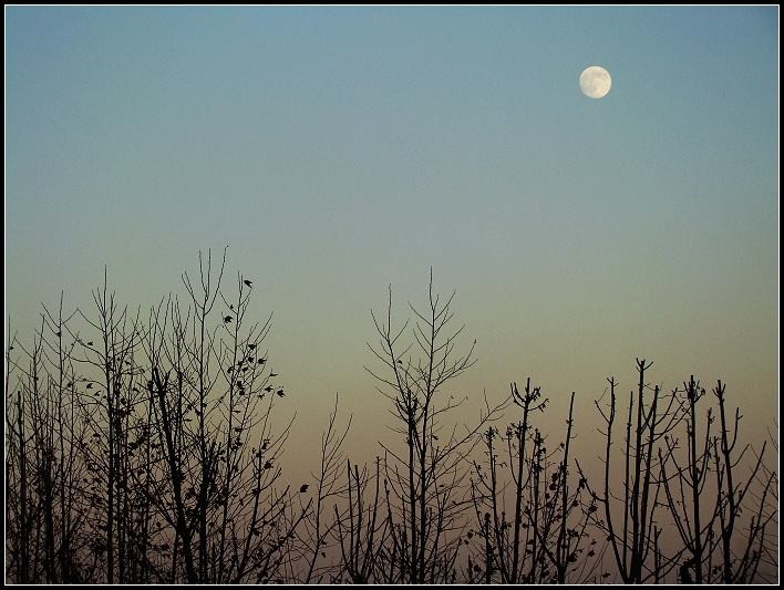 晴空朗朗疏星淡,夜色灰灰绿树稠。