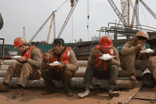 负重倾身背压砖,蹣跚步履掇梯悬。