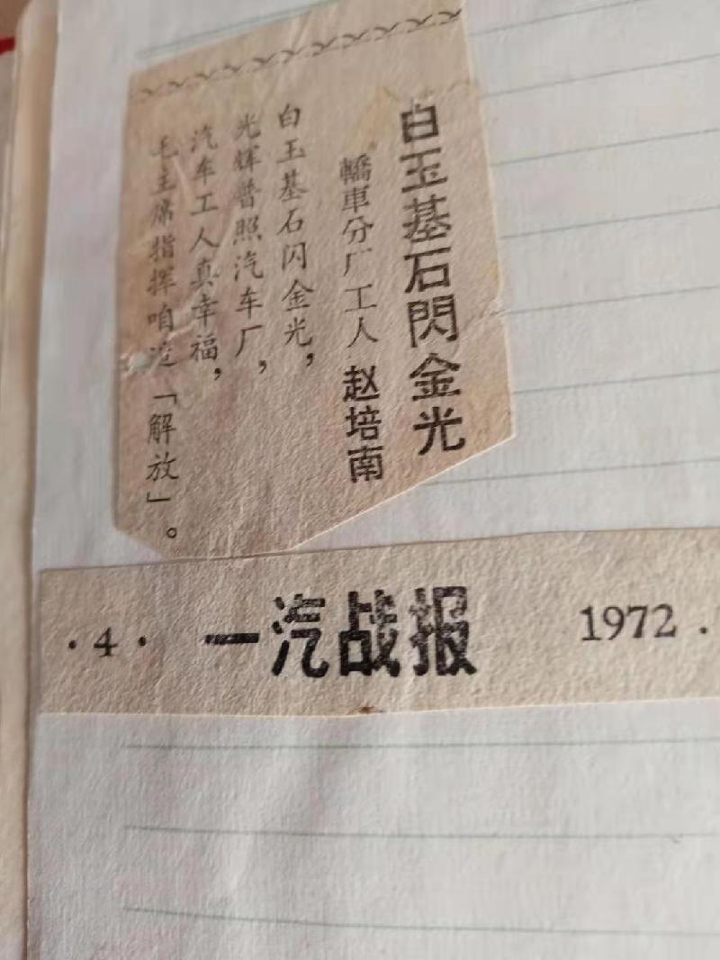 手握方向盘眺望正前方毛主席,毛主席高大的身影,来到我的车旁,我激动的红心,要跳出胸膛。我入厂的第一天,就有一个美好的希望,作为新中国的第一代汽车工人,一定要为毛主席争光。拿起风动扳手不知累,日夜奋战在装配线上,手握方向盘,眼望北京城,想见毛主席,不分日夜想,美好的愿望,今天实现啦!