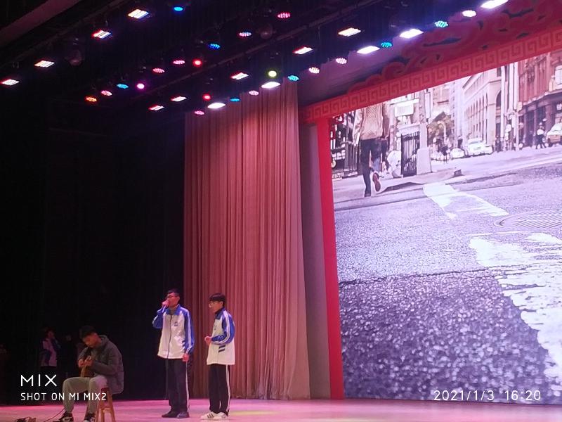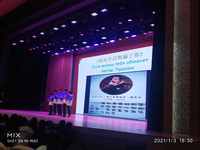 2021年1月3日下午,全体高一师生在云天集团报告厅举办了英语励志演讲会决赛。中间有一些英语节目表演:小品、课文剧、英文歌曲等。为了活跃气氛,积极参与,俄语生3、4班的同学俄汉双语朗诵了普希金的诗歌《假如生活欺骗了你》,效果都很不错。只是个别学生在说英语的时候还受地方口音的影响,有一种山东英语味道:有的学生读音不够准确,还需要多读,多纠正;配音口型有时候对不上,缺乏锻炼。需要教师提高,抓住课堂。