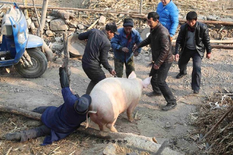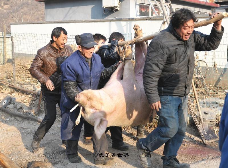 只见四五个个彪形大汉,协助屠夫,把一头三四百斤重的大肥猪四蹄用尼龙绳子捆绑好,使出浑身吃奶的劲头,抬上一个临时找到的足有床板大小的门扇上,只见三四百斤重得大肥猪嘴里吐着白沫,发出“嗷嗷”的撕心裂肺的嚎叫声,一个村子都能听得见。这仿佛是一声集合号角,吸引来里三层外三层的看热闹的大人小孩子们!但见屠夫不慌不忙地从一搭肩上掏出将近二尺长的明晃晃尖锐钢刀,瞄准大肥猪的猪头和前胸的结合部,也就是脖子部位,一刀下去,殷红殷红的猪血顿时喷涌而出,大肥猪脖子底下提前准备好的铜盆里一会儿就滴满了多半盆猪血。