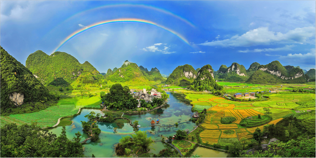 右江河水流千里,云海高峰透彩光。