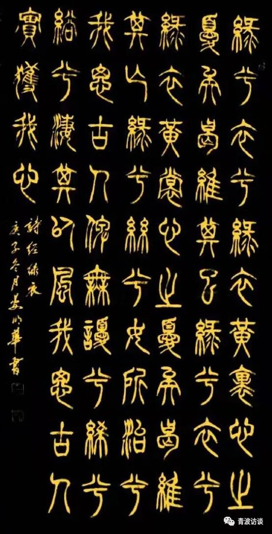 我看在眼里,激动于心。这幅全部用篆书精心创作的《毛公颂》长卷,足有20多米的长度。可想而知,用篆书的书体创作如此长度的长卷作品,其难度和所花费的创作时间都是很惊人的。更令人感慨万端的是,这不仅体现了作者对伟人毛泽东丰功伟绩的无限缅怀,同时也反映着一个书家对毛泽东那份深深的、浓浓的敬仰之情。