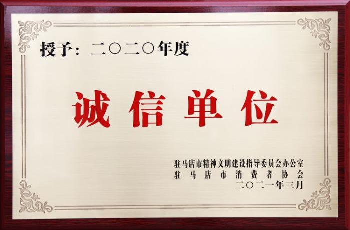 诚信是中华民族的传统美德,自古以来,不管是平民百姓还是高官达人,无不以诚信作为品格判断的重要标准。作为企业,诚信尤为重要。驻马店市精神文明建设指导委员会办公室联合驻马店市消费者协会开展了2020年度“文明诚信、守法经营”诚信单位评选活动。经审议认定,授予河南省京都实业有限公司为2020年度诚信单位以及2020年度“文明诚信 守法经营”荣誉称号。