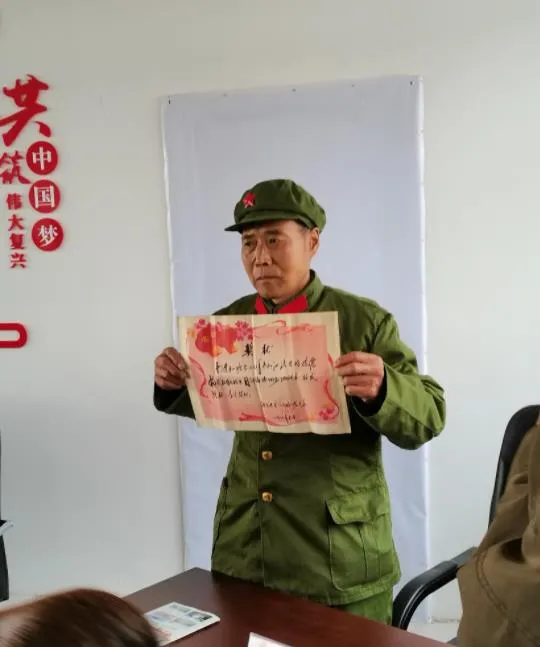 在“咱当兵的人”的旋律中,曾经参加唐山大地震救灾抢险立功的退伍军人陈玉贵,身着绿色军装,讲述当年克服困难、舍生忘死、保护人民的先进事迹,陈玉贵展示了珍藏几十年的军用物品和当年立功的奖状。