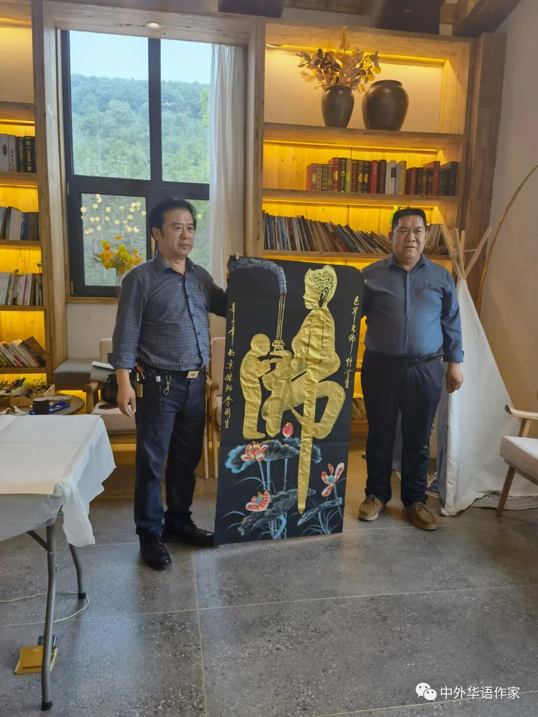 景区董事长李增书先生亲手接过著名书法家李关生先生为景区创作的佛画
