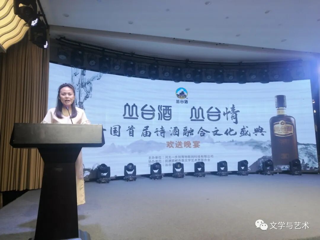在晚上进行的“丛台酒·丛台情”全国首届诗酒融合文化盛典欢送晚会上,河北省邯郸市政协副主席、民建邯郸市委主委李海平先生发表了热情洋溢的致辞,丛台酒业销售公司市场部总经理秦玥女士致祝酒词,一百余位参会作家、诗人、书法家、画家纷纷举杯品尝丛台美酒,并争先恐后地回答了主持人有关丛台酒的问题,获得了丛台酒业价值不菲的珍藏丛台美酒,秦玥总经理给答对题的嘉宾颁发了奖品。多才多艺的参会代表纷纷登台表演了丰富多彩的演唱、朗诵等节目,著名歌手、星光大道冠军刘晓女士引吭高歌一曲《大姑娘美大姑娘浪》,将整场“丛台酒·丛台情”全国首届诗酒融合文化盛典晚会推向了高潮。