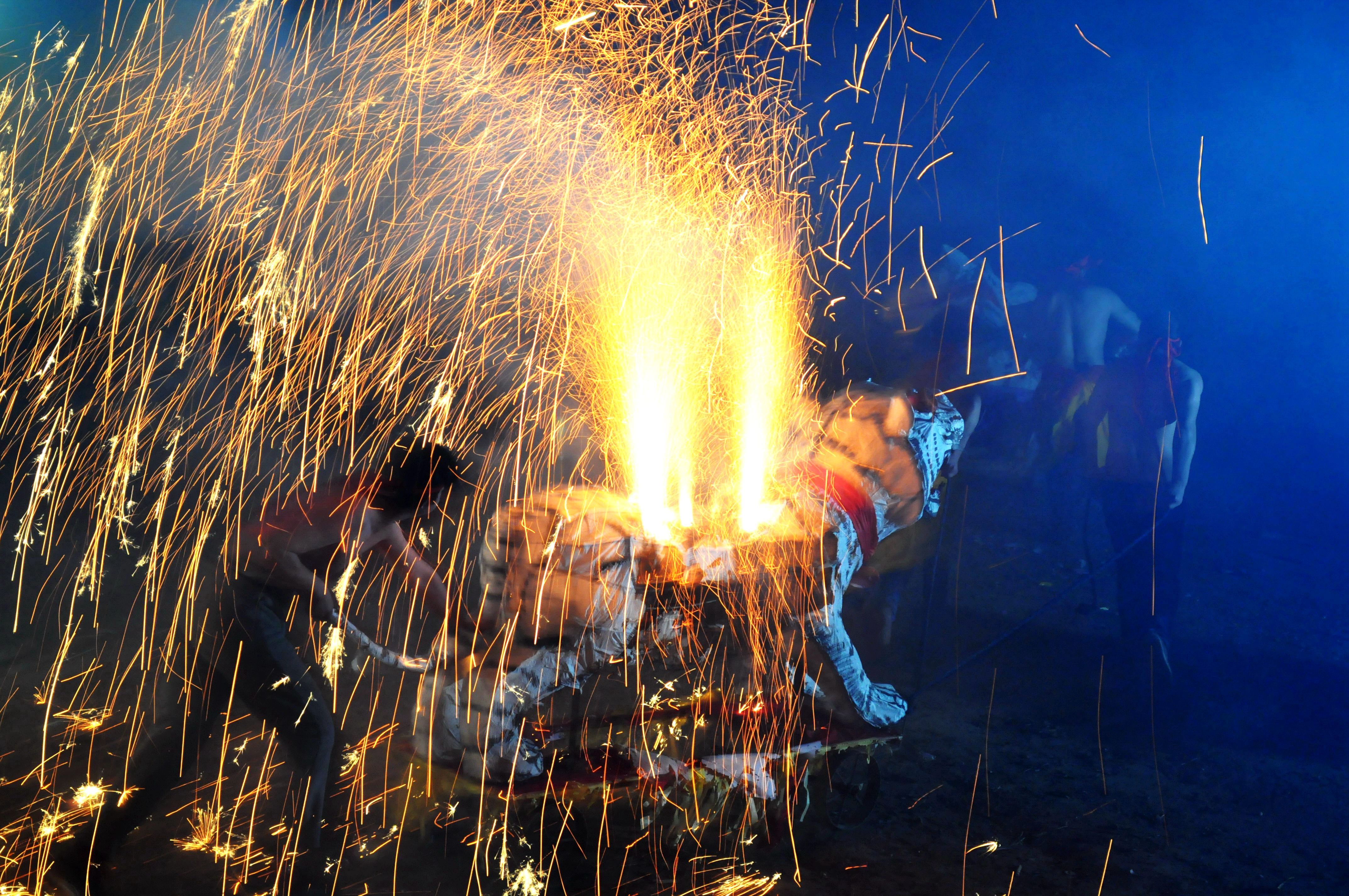 前拉后推燃放的南张井老虎火。何克宁 摄