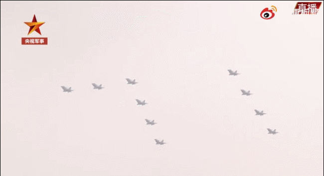 空中护旗梯队悬挂党旗和巨幅标语飞过