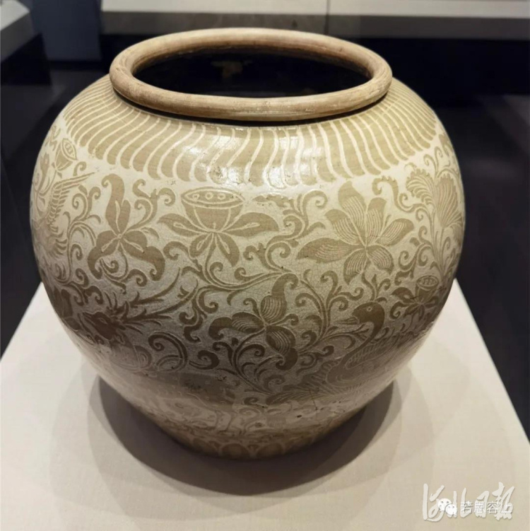 井陉窑出土金代淡青釉剔花荷莲鹿雁纹大罐。阎国文供图