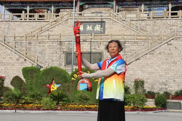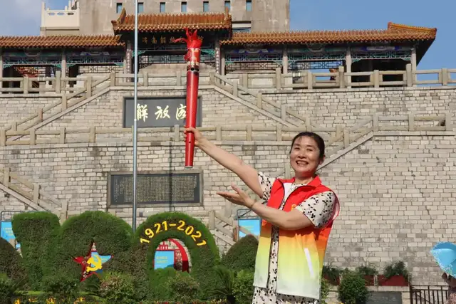 火炬手苏宝珍站在铭心广场,讲述党的早期创始人之一邓恩铭,为宣传马列主义、创建中国共产党所作出的积极努力和贡献。