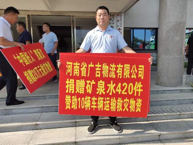 据悉,此次爱心捐赠共募捐到来自河南省广吉物流有限公司捐赠的矿泉水420件,出动铲车2台、半挂运输车3台、后八轮5辆。